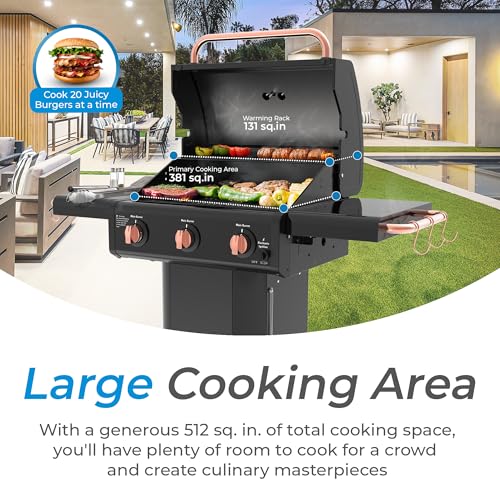 Kenmore 3-Burner Gas Grill | Foldable Side Tables, Cast Iron Cooking Grates, Warming Rack, Hooks for BBQ Grilling Tools, Propane Gas Barbecue Grill, 30,000 BTUs, Black with Copper Accent