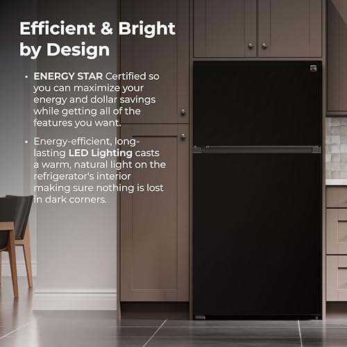 Maximize your kitchen space with the Kenmore 33″ Top-Freezer Refrigerator in black. With 20.4 cu. ft. of capacity and a 33-inch-wide footprint, its full capacity size offers plenty of room for fresh and frozen essentials. The standard-depth design lets it stand proud while storing party trays, groceries, and everything in between. Full-width, adjustable glass shelves give you the flexibility to store wide or tall items with ease. Three clear door bins hold gallon jugs, condiments, and dressings, while two clear freezer door bins help keep smaller items organized. Humidity-controlled crispers keep produce fresher, longer, and the dedicated dairy compartment stores butter and spreads at just the right temperature. Long-lasting LED lighting casts natural light throughout the fridge so nothing gets lost in the back. The recessed pocket handle and flush-front design add a modern, easy-to-clean look that complements any kitchen style. ENERGY STAR certified for efficiency, and compatible with a factory installed icemaker that produces up to 3 pounds of crescent-shaped ice per day, this refrigerator is a smart, stylish solution for any home.
