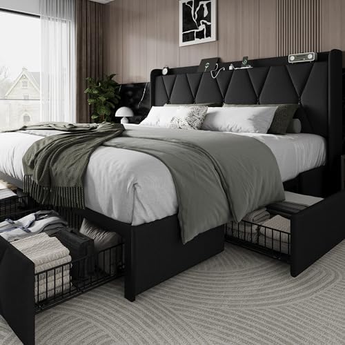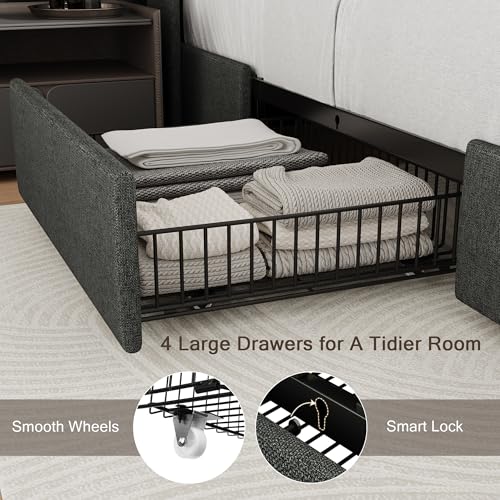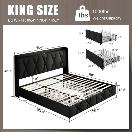 Specification: King Size Bed Frame with 4 Storage Drawers and Charging Station, Upholstered Platform Bed Frame with Storage Headboard, No Box Spring Needed, Easy Assembly, Black