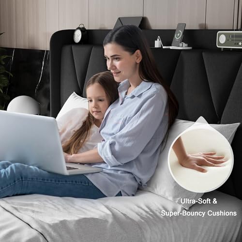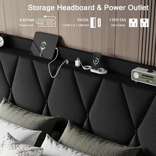 Storage Headboard & Charging Outlet: Equipped with 2 standard AC outlets, 1 USB port & 1 Type-C port, the king bed frame supports the charging of electronic devices. For easy access, you can also store your books, glasses, etc. on the storage headboard