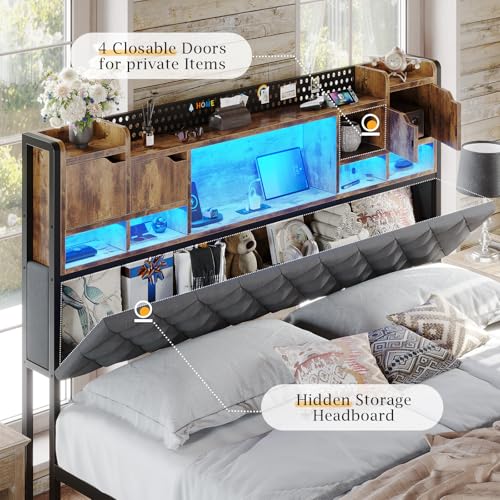 King Size Bed Frame with Headboard, Upholstered King Bed Frame with 3-Tier Storage Shelves & Hidden Space, King Platform Bed Frame with Charging Station & LED Lights, Heavy Metal Slat Support