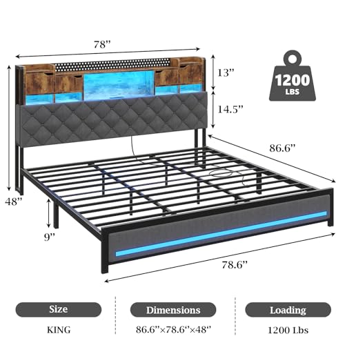 Specification: King Size Bed Frame with Headboard, Upholstered King Bed Frame with 3-Tier Storage Shelves & Hidden Space, King Platform Bed Frame with Charging Station & LED Lights, Heavy Metal Slat Support