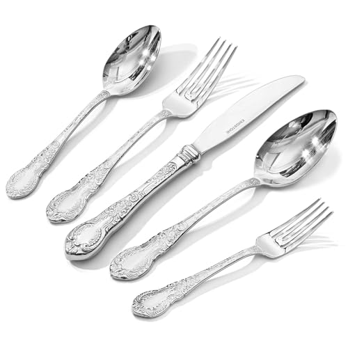 Specification: KINGSTONE Vintage Carved Silverware Set, 20-Piece 18/10 Stainless Steel Flatware Cutlery Set with Retro Royal Thick Handle, Tableware Utensils for Home, Restaurant, party, Wedding, Dishwasher Safe