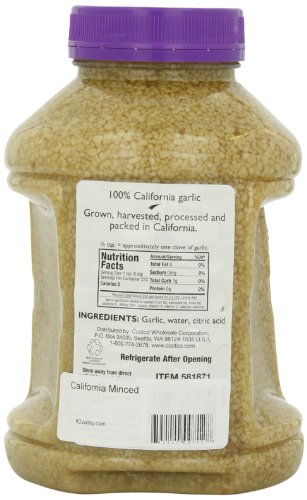 Kirkland Signature minced California garlic 48 ounce. Grown, harvested, processed and packed in California.