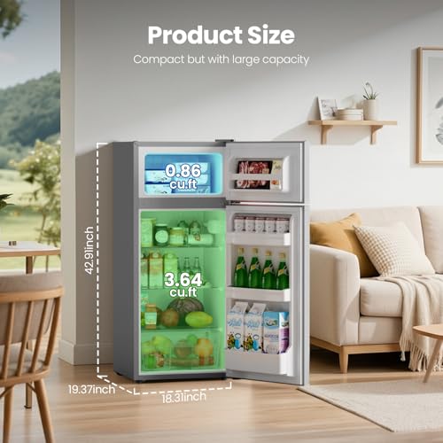 Compact Size & Large Capacity: The double door fridge with 19.37″(D)x 42.91″ (H)x 18.31″(W). 0.86 Cu.ft freezer features ample storage space can be used storage your ice cream,meat. And 3.64 Cu.ft fridge area with fruit and vegetable drawer Separately,can keep fruits and vegetables fresh longer. The inside of the door with racks (which prevent from falling)also can store food,you can place bottles and cans.More spacious than usual mini-fridge