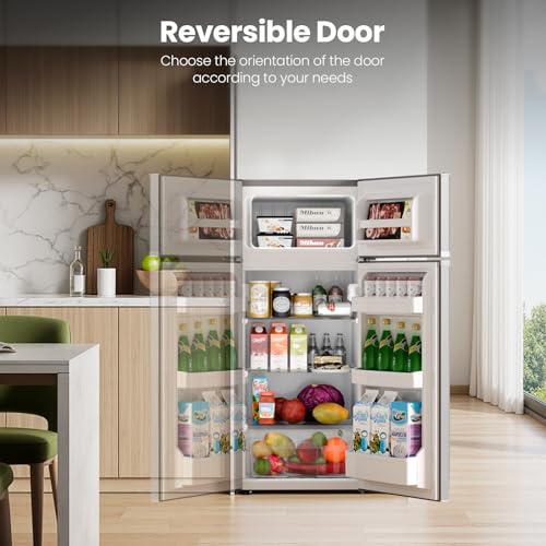 Specification: Kismile 4.5 Cu.Ft Mini Fridge with Freezer, Compact Mini Refrigerator with Adjustable Removable Glass Shelves,Small Fridge with 2 Doors for Home,Kitchen,Dorm,Apartmen,Grey