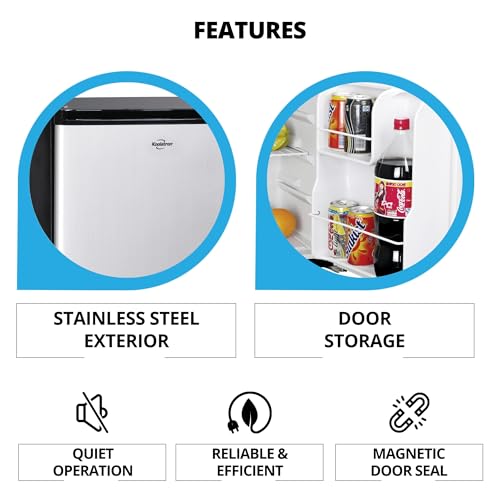 - IDEAL FIT: This compact fridge features a sleek black and stainless steel finish. Door storage compartments help organize beverages and snacks efficiently, fitting seamlessly into small spaces.