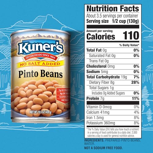 Specification: Kuner’s No Salt Added Canned Pinto Beans, Plant Protein and Fiber, Gluten Free, Vegan, Fat Free, 12 Pack of 15.5 oz Cans