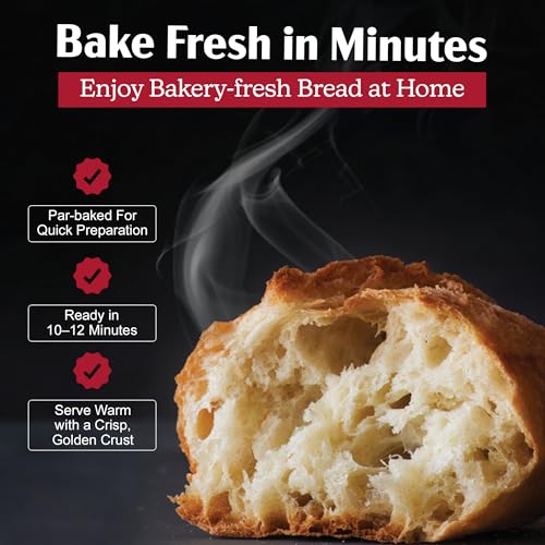 A hearth-baked short baguette made with La Brea Bakery starter. The flavor profile is that of a French bread made with a small quantity of levain, which creates the mild taste of long natural fermentation. The bread is a rounded cylinder (flat on the side where it is baked on the hearth), golden brown with the three distinct cuts on the top. The bottom of the roll is lightly dusted with cornmeal. The interior of the roll is soft and shows the random open cell structure typical of well-fermented bread dough. The aroma of the bread is a combination of baked notes and yeast fermentation.