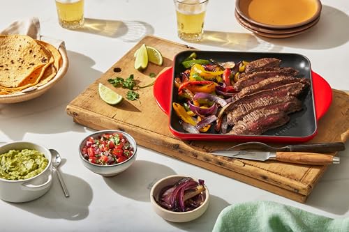 The enameled cast iron Signature Square Skillet Grill brings the delicious flavor of outdoor grilling conveniently indoors. The interior surface is finished with a black satin enamel that eliminates the need for the traditional seasoning and maintenance of raw cast iron, and the enamel develops a natural patina over time that is ideal for searing. The high ridges create perfect sear marks, and allow excess fat and grease to drain away from the food. Loop handles make it easy to maneuver a full pan, and the spouts on two sides allow for drip-free pours. Individually crafted by French artisans from the finest quality materials since 1925, Le Creuset enameled cast iron cookware is beloved for its perfected design and exceptional heat retention that produces superior results from stove to oven to table. Designed for generations of durability, the porcelain enamel requires no seasoning, minimizes sticking and is dishwasher-safe.