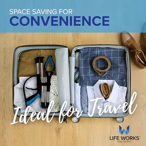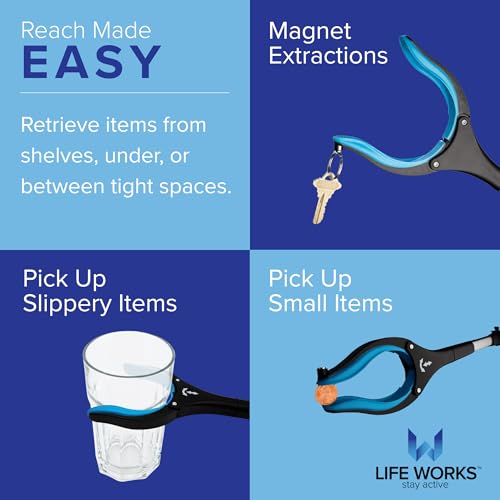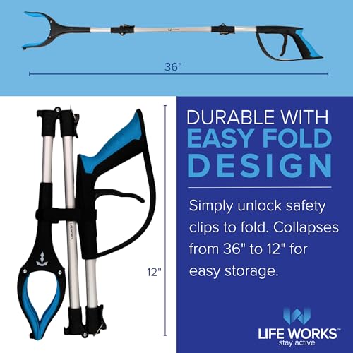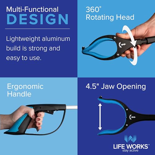 Specification: LIFE WORKS Reacher Grabber Tool, 360° Rotating Head, 4.5” Jaw Opening, Ergonomic Handle, Folds for Storage, Aids in Reaching Items High or Low, Surgery Recovery, Hip Replacement (2 Pack)