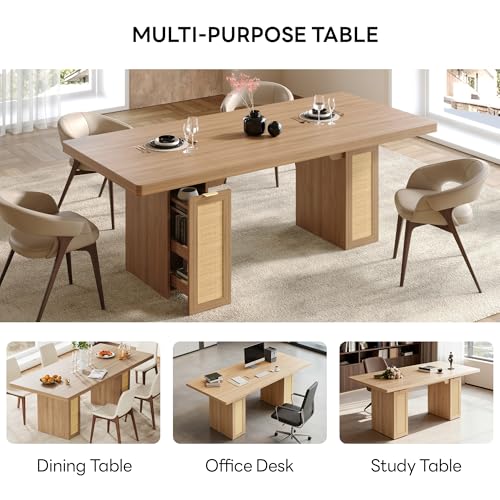 Specification: LIKIMIO 78.7″ Farmhouse Dining Table for 6-8 People, Extra Thick Wood Top with 2 Hidden Adjustable Storage Drawers, Modern Woven Rattan Table for Dining Room, Kitchen, Living Room, Rustic White