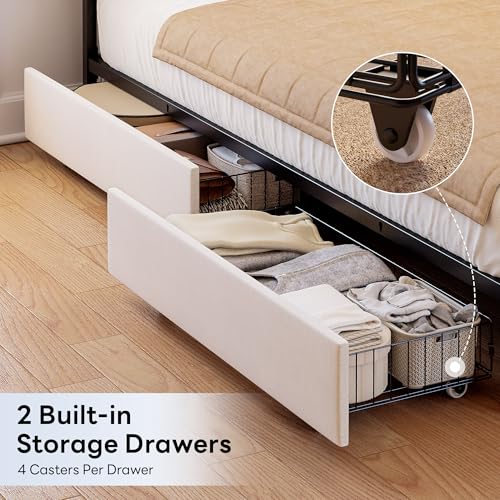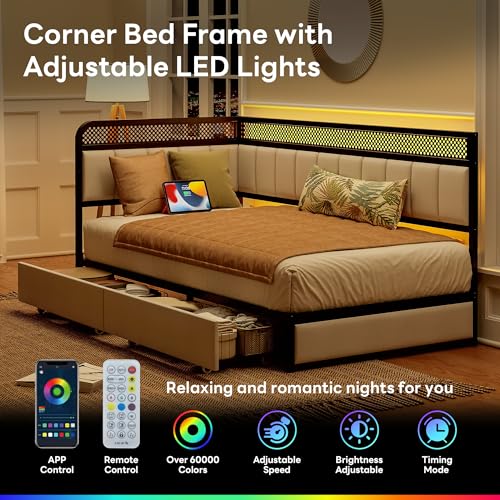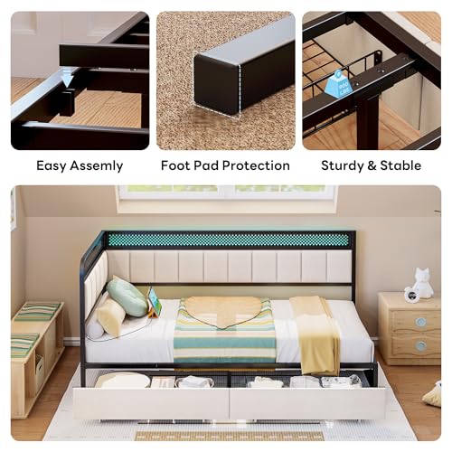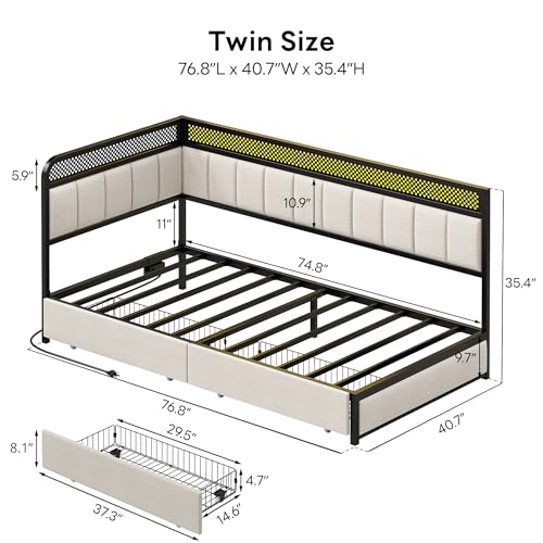 Specification: LIKIMIO Twin Corner Bed Frame with Storage Drawers and Charging Station, Modern Twin Daybed with LED Lights and Upholstered Guardrail, Beige