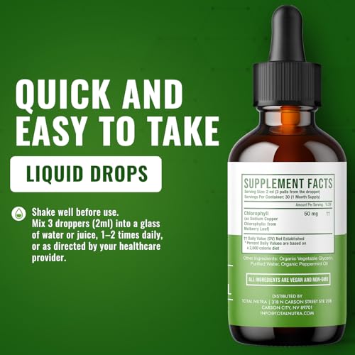 Liquid Chlorophyll Drops 50mg: Vegan Chlorophyll Liquid Drops for Natural Energy Boost, Immune Support, Body Detox for Skin Care, Internal Deodorant | Mint Flavor, Non-GMO, Gluten Free Total Nutra 2oz