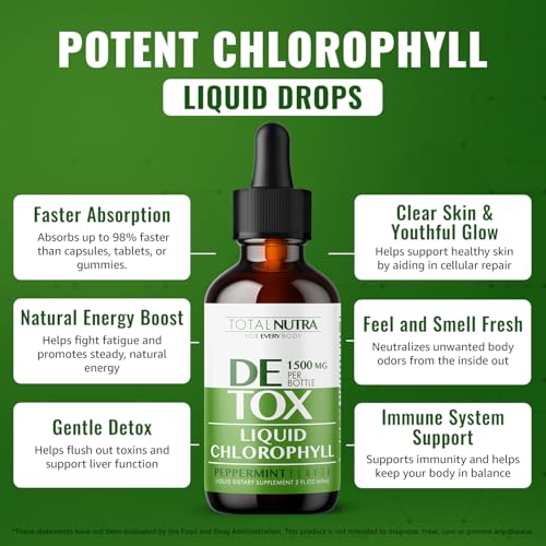 ONLY THE BEST LIQUID CHLOROPHYLL 50MG: Don’t waste time & money on chlorophyll supplements with no results. Total Nutra’s powerful & efficient chlorophyll supplement is made with chlorophyllin, a more easily absorbed form of chlorophyll extract, so these Vegan Liquid Chlorophyll Drops for water start working immediately, with a faster 98% absorption rate vs. chlorophyll capsules, gummies or tablets.