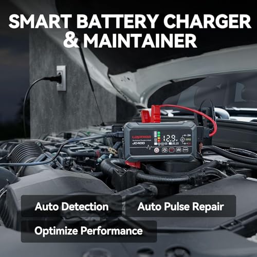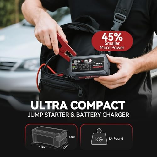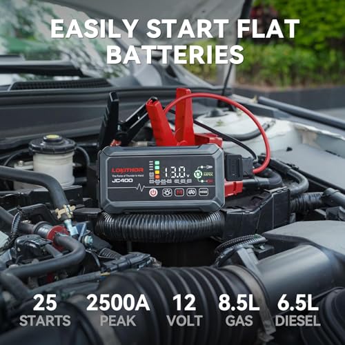 Specification: LOKITHOR JC400 9-in-1 Battery Charger and Jump Starter, 2500A 12V Portable Jump Box for Car Upto 8.5L Gas/6.5L Diesel, 750mA/1A/2A, 6V/12V Automotive Battery Maintainer, Trickle Charger and Desulfator