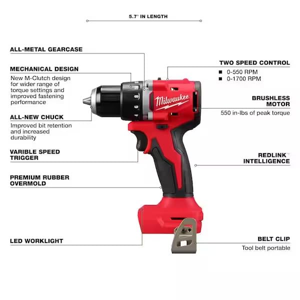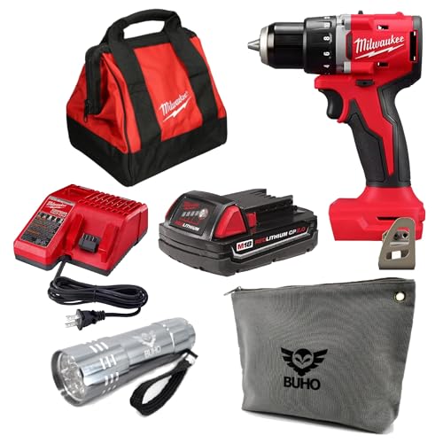 Specification: M18 18V Brushless Cordless 1/2 in. Compact Drill/Driver Bundle with (1) 2.0 Ah Battery, Charger, Milwaukee Tool Bag, Buho Zipper Pouch and Flashlight