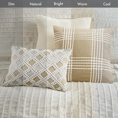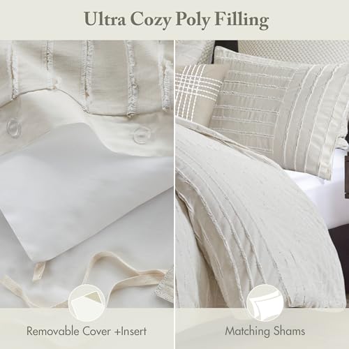 Madison Park King Comforter Set Clipped Jacquard Stripes with Buttons Boho Comforter for a King-Size Bed, Cotton Oversized Comforters with Removable Cover Boho Bedding, King Ivory 9 Piece
