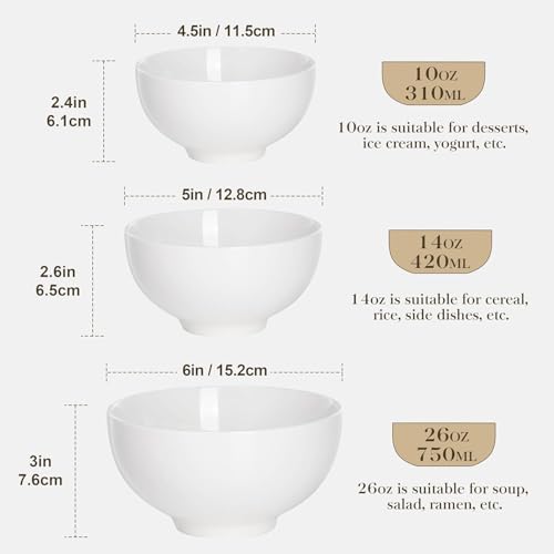 【Cereal Bowls Set of 4】 MALACASA 26 OZ bowls set Dimensions (each): width=6 inch, height=3 inch, Capacity: 26 oz. The newly designed bowl set impresses with a classic round shape and white ceramic, making it great for all-purpose restaurant-style bowls for kitchen or home.