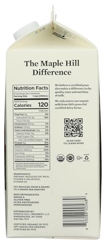 MAPLE HILL ORGANIC GRASS FED 2% MILK: Our 100% grass-fed organic milk is made from pasture-raised, happy, healthy cows. We believe that the happier the cows, the better-tasting the milk. 100% grass-fed milk is everything you love about organic, and more – better for us, better for cows, better for the land and better for farmers. ORGANIC 2% MILK: With plenty of rich natural flavor but a reduced fat content, our 2% milk is packed with the same essential nutrients as our organic whole milk, and is fortified with vitamins A and D. A great source of calcium for the whole family, this artisanal quality organic 2% milk is a great addition to your morning coffee, and is also a delicious ingredient in hot chocolate, milkshakes and a range of sweet and savory cooking. USDA ORGANIC: All of our products are PCO certified organic, and USDA organic which means they contain no added hormones, no GMOs, and no toxic pesticides. Full of natural flavor, this Maple Hill reduced fat milk is ultra pasteurized. Nutritious and satisfying, Maple Hill organic milk is an ideal snack time milk for toddlers, kids and adults. .MAPLE HILL CREAMERY: 100% grass-fed organic dairy. Unlike conventional organic dairy, Maple Hill cows eat 100% grass, have outdoor access 100% of the year and are 100% pasture raised. We are rooted in regenerative farming, sustainable packaging and the ethical treatment of animals. Based in the USA our 150 small family run farms are located in NY State.