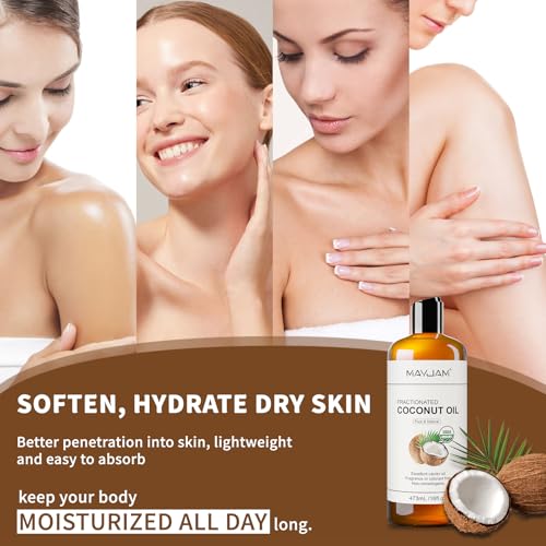 Organic Fractionated Coconut Oil For Essential Oils: Our coconut massage oil is one of the most versatile oils on the market. Its an ideal carrier oil for diluting essential oils, its hydrating and has a very mild scent. This organic virgin coconut oil is easily blends with any essential oil while keeping its natural scent and benefits, such as diluting MAYJAM essential oils, like Lavender, Vanilla, Tea Tree, or Sandalwood oil ect., helping your skin absorb them smoothly, without irritation or dryness