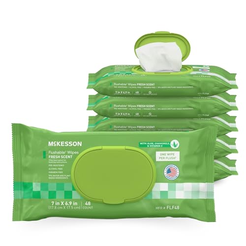 Specification: McKesson Flushable* Adult Wet Wipes – 288 Wipes (6 Pack of 48) – Aloe & Vitamin E, Plant-Based Cleansing Wipes, Scented