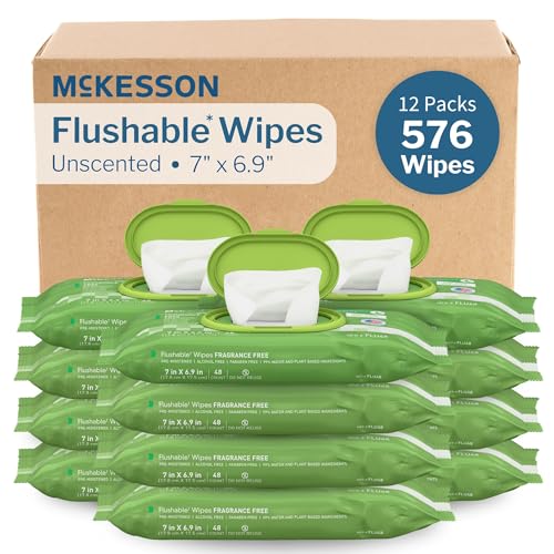 Specification: McKesson Flushable* Adult Wet Wipes – 576 Wipes (12 Pack of 48) – Aloe & Vitamin E, Plant-Based Cleansing Wipes, Unscented