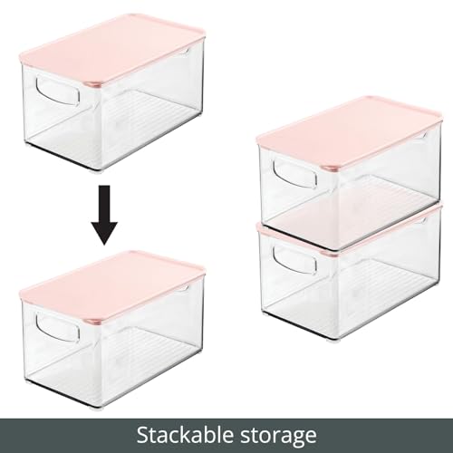 mDesign Deep Plastic Bathroom Storage Bin Box, Lid/Built-in Handles, Organization for Makeup, Hair Styling Tools, Toiletry Accessories in Cabinet, Shelves, Ligne Collection, 2 Pack, Clear/Pink