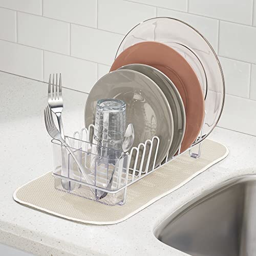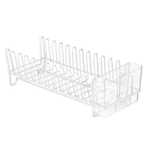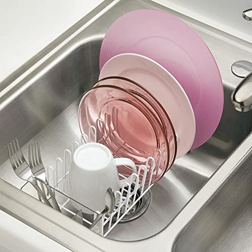 mDesign Kitchen Sink Dish Drainer – Small Metal and Plastic Dish Rack for Kitchen Sink – Dish Drying Rack with Drip Tray for Plates and Cutlery Basket – White/Clear