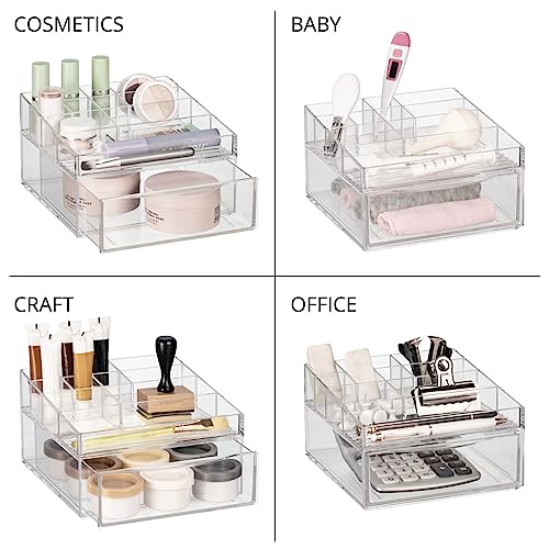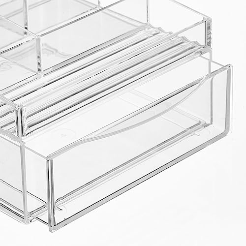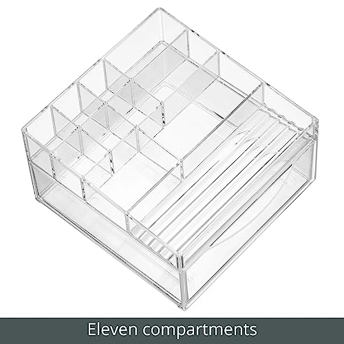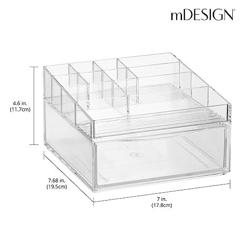 mDesign Plastic Divided Makeup Organizer Holder Bin with Front Drawer for Bathroom Vanity, Countertop Storage – Cosmetic Organization Holds Palettes, Brushes, Accessories – Cadi Collection – Clear