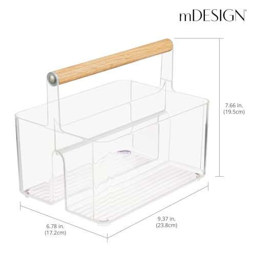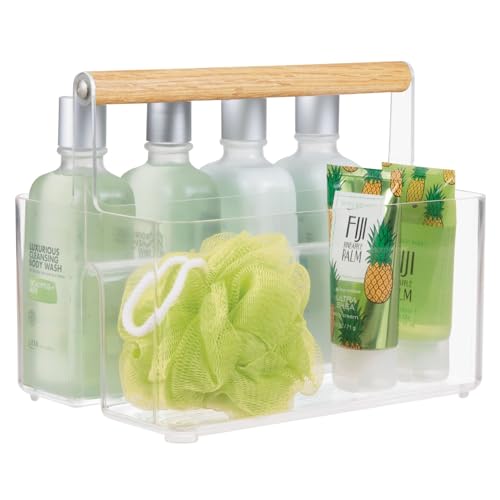 Specification: mDesign Plastic Portable Shower Caddy Divided Basket Bin Storage Organizer with Bamboo Handle for Bathroom, Dorm, Shelf & Cabinet Holds Shampoo, Conditioner – Aura Collection, Clear/Natural