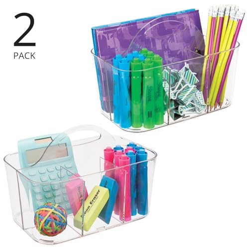 Specification: mDesign Plastic Small Office Storage Organizer Utility Tote Caddy with Handle for Cabinets, Desks, Workspaces – Holds Desktop Office Supplies, Pencils, Staplers Lumiere Collection, 2 Pack, Clear