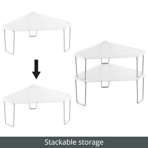 COMPACT DESIGN: Corner design is ideal for smaller spaces; Non-slip feet keep the storage shelf from slipping, especially when stacked while also protecting your counter surfaces from scratches; Fold the shelf flat for space-saving storage when not in use; Perfect for apartments, condos, dorm rooms, RVs, cabins, campers and cabins