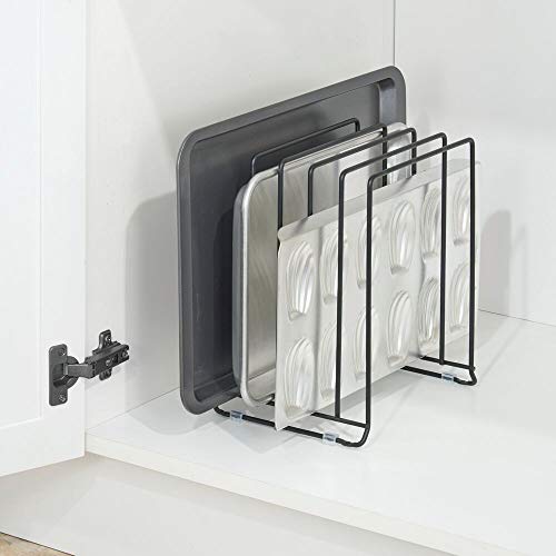 5 COMPARTMENTS: Streamline and organize your kitchen with this convenient cookware organizer rack; Organize and securely hold cooking pots, sauce pans, lids, cookie sheets, muffin tins and cutting boards; Use on a counter top, in a cupboard or even under the sink to reduce clutter; Reduce the risk of scratching and damage by keeping cookware separated into individual compartments; Save time – no more searching for the right pan or lid, it will be quick and easy to locate with this handy helper
