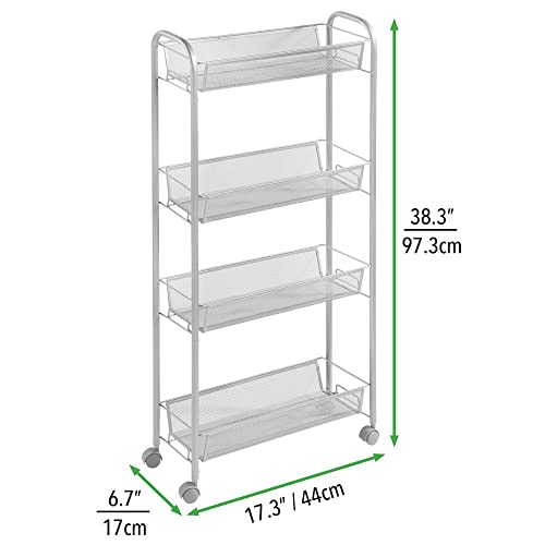 mDesign Slim Steel Metal Rolling Utility Cart Storage Organizer Trolley with 4 Basket Shelves for Laundry Room, Kitchen, Bathroom Organization – Narrow Holder for Detergent – Biro Collection, Silver
