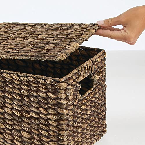 mDesign Woven Water Hyacinth Rectangle Storage Organizer Basket Bin with Topper Lid and Handles – Natural Farmhouse Holder Containers for Closet, Bedroom, Bathroom, Office – Set of 3 – Dark Brown