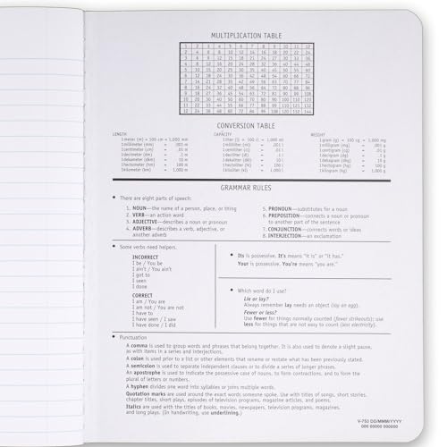 Colorful cover includes a class schedule, multiplication tables, conversion tables and grammar rules