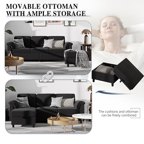Meilocar Sectional Sofa Couch for Living Room, 79″ Sectional Couches with Ottoman, L Shaped Couch with Armrests Side Storage Pockage, 3-Seat Sofa Couches for Apartment, Black
