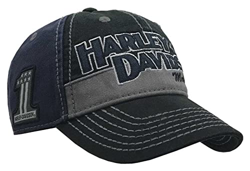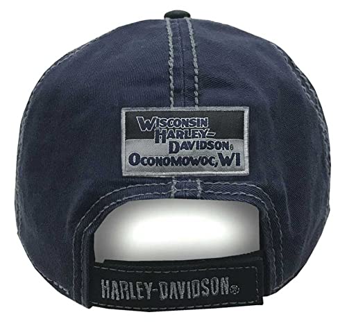 Harley-Davidson Men’s Chain Stitch Colorblocked Baseball Cap – Blue, Black & Gray. Comfortable six panel structured curved bill hat. Constructed from durable 100% cotton. Awesome embroidered bold H-D text graphic on front. Bonus woven #1 logo patch on side panel. Custom patch on back features our Wisconsin Harley dealer embroidery. Adjustable closure. High-quality and super comfortable ballcap, perfect for any Harley enthusiast.