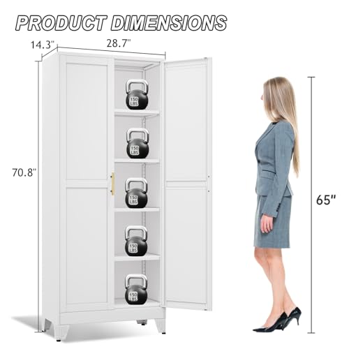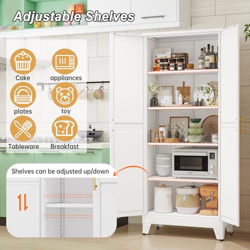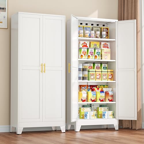 Specification: Metal Pantry Cabinet with 2 Doors and Adjustable Shelves – 71″ Kitchen Storage Cabinet with Gold Handles – Versatile Storage for Kitchen, Bathroom, Dining Room, Utility Room – White