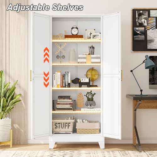 Metal Pantry Cabinet with 2 Doors and Adjustable Shelves – 71″ Kitchen Storage Cabinet with Gold Handles – Versatile Storage for Kitchen, Bathroom, Dining Room, Utility Room – White