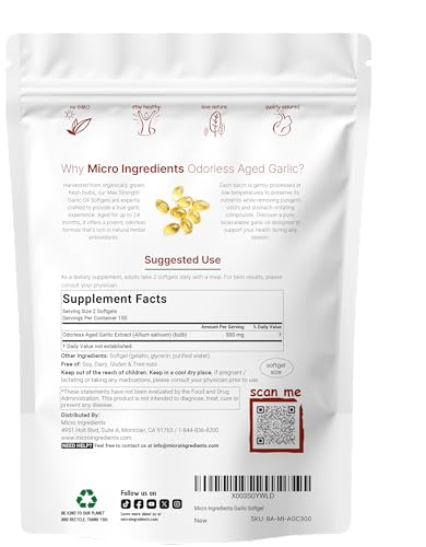 Specification: Micro Ingredients Odorless Garlic, 300 Softgels | 2 Years Aged Garlic Extract, Grown Allium Sativum Bulb | Potent Antioxidant Supplement*