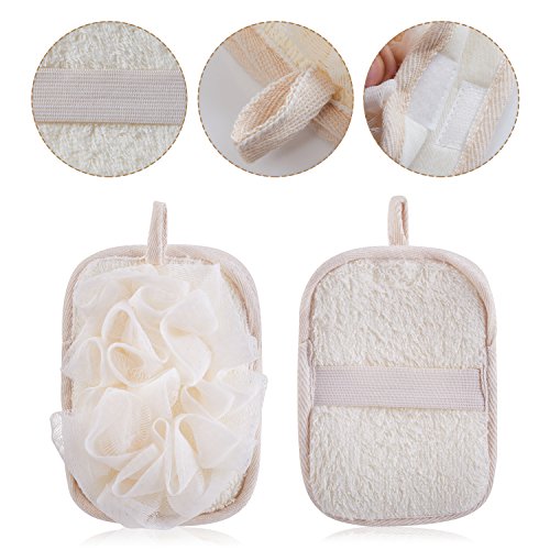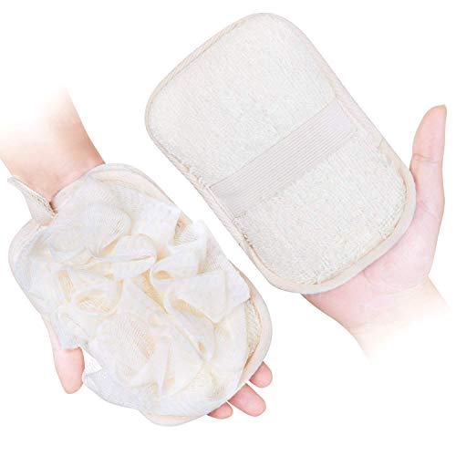 🎈2 in 1 Design—Bath Mitten+Loofah Sponge. Premium loofah create great lather to clean body. Easy to hang with a cute string