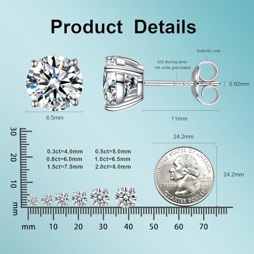 Specification: Moissanite Stud Earrings, Round Cut D Color VVS1 Clarity Lab Created Moissanite Earrings Studs 18K White Gold Plated 925 Sterling Silver Jewelry for Women Men