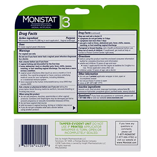 Specification: MONISTAT 3-Dose Yeast Infection Treatment For Women, 3 Prefilled Cream Applicators