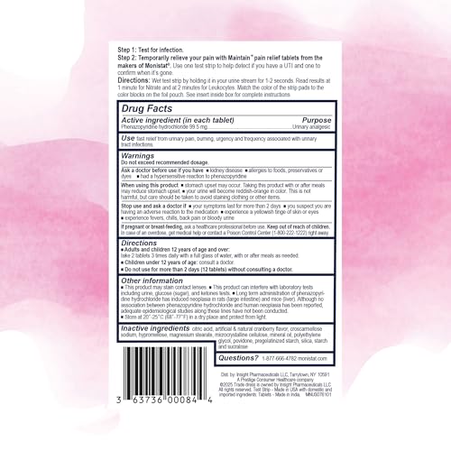 From the Makers of Monistat, Maintain UTI 2-in-1 Test & Pain Relief Kit includes everything you need to test for a UTI at home and manage UTI pain until you can see a doctor. This UTI kit contains two easy to use and read urinary tract infection strips to test for infection. Get accurate UTI test results in just two minutes in the convenience of your own home and get temporary relief from urinary tract infection symptoms like burning, pain, and urgency in one easy-to-use kit. The kit also includes 12 maximum-strength pain relief tablets made with the number 1 doctor-recommended ingredient for UTI pain* available in over-the-counter medicine. Covered in a cranberry-flavored coating, the urinary pain relief tablets are the highest dose of pain relief available without a prescription. Directions: Wet UTI test strip by holding it in your urine stream for 1-2 seconds. Read results at 1 minute for Nitrate and at 2 minutes for Leukocytes. Match the color of the strip pads to the color blocks on the foil pouch. See insert inside box for complete instructions. *IQVIA August 1, 2023- July 31, 2024.