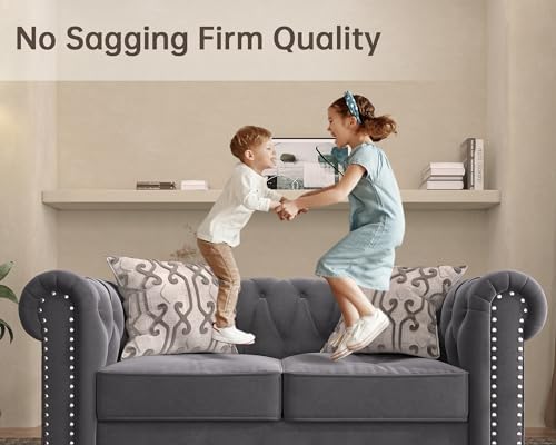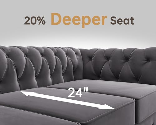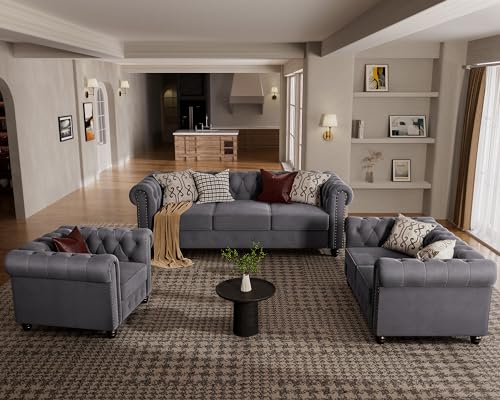 Specification: Morden Fort 3 Piece Classic Chesterfield 6-Seater Set, Tufted Chair & Loveseat & Sofa Solid Wood Legs Thick Cushion, Pet-Friendly Couch Set Furniture for Living Room Bedroom Apartment, Velvet Grey