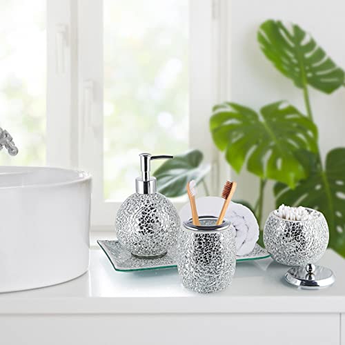 Mosaic Glass Bathroom Accessories Set, Modern Luxury Bath Ensemble, Includes Soap Dispenser & Cotton Swab Jar & Toothbrush Holder & Vanity Tray (Shiny Silver)