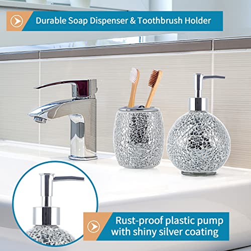 DURABLE AND RUSTPROOF: This bathroom accessories set are handmade with high quality mosaic glass, matched with shiny silver metal lid, and plastic pump with the same silver coating, which are durable, rustproof and easy to clean