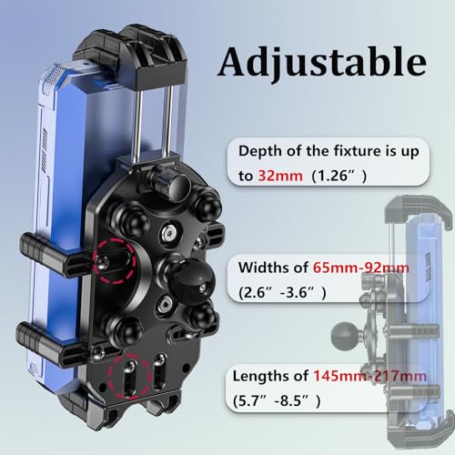 Wide Compatibility: Phone holder for motorcycle depth of the fixture is up to 32mm(1.26”), and it is paired with a thickened anti-slip pad. It is suitable for all smartphonne with lengths of 145mm-217mm(5.7”-8.5”), widths of 65mm-92mm(2.6”-3.6”), and thicknesses less than 32mm (with case). It is perfectly suitable for iPhone 15 Pro Max (wearing a thick anti-fall case), Samsung S23 Ultra, three-proof mobile phones (such as AGM, CAT) and other devices.
